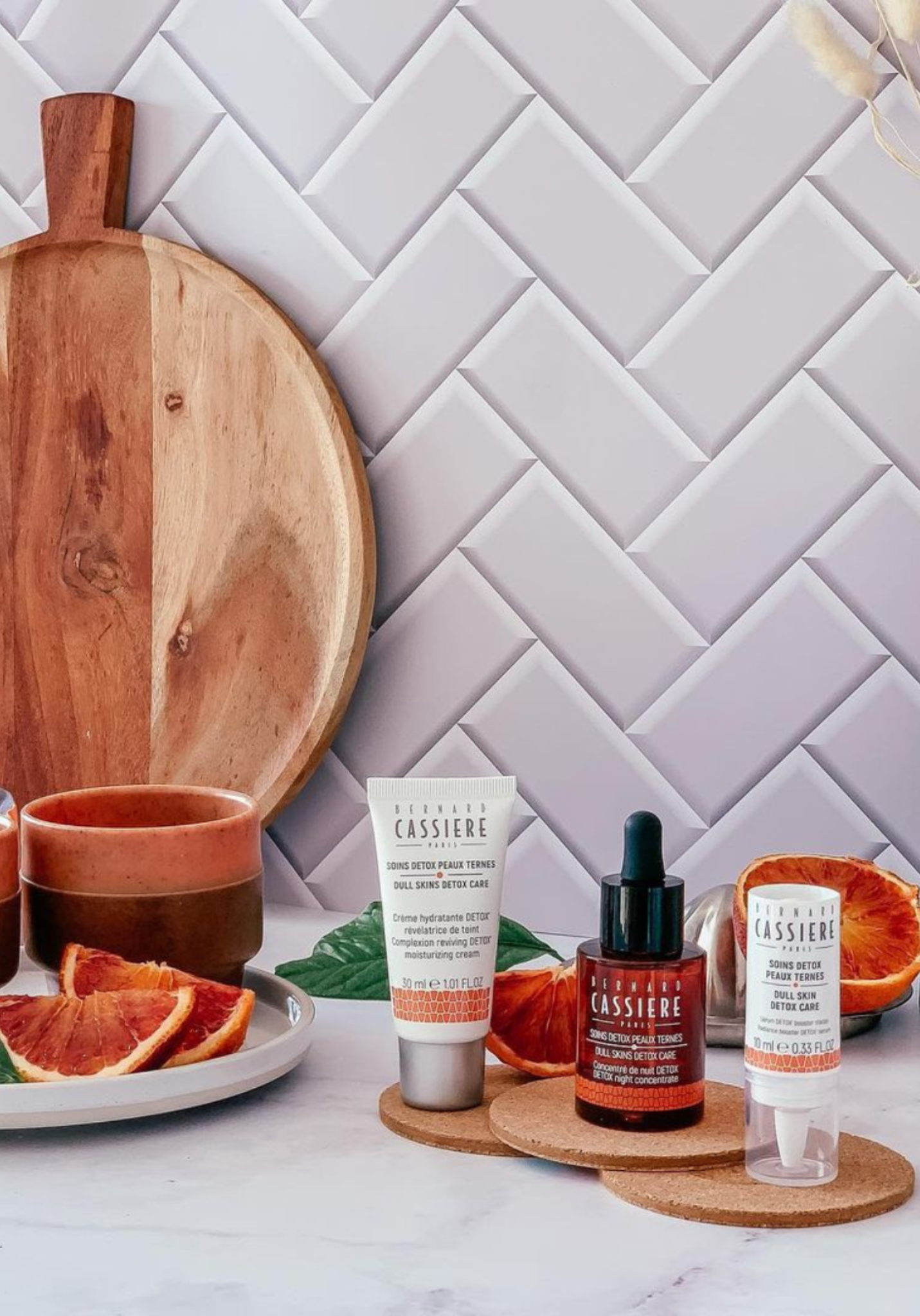 Kompleks “DETOX” [ekstrakt z krwistej pomarańczy + olejek eteryczny z mandarynki]: detoksykuje i wzmacnia matową i pozbawioną blasku skórę.